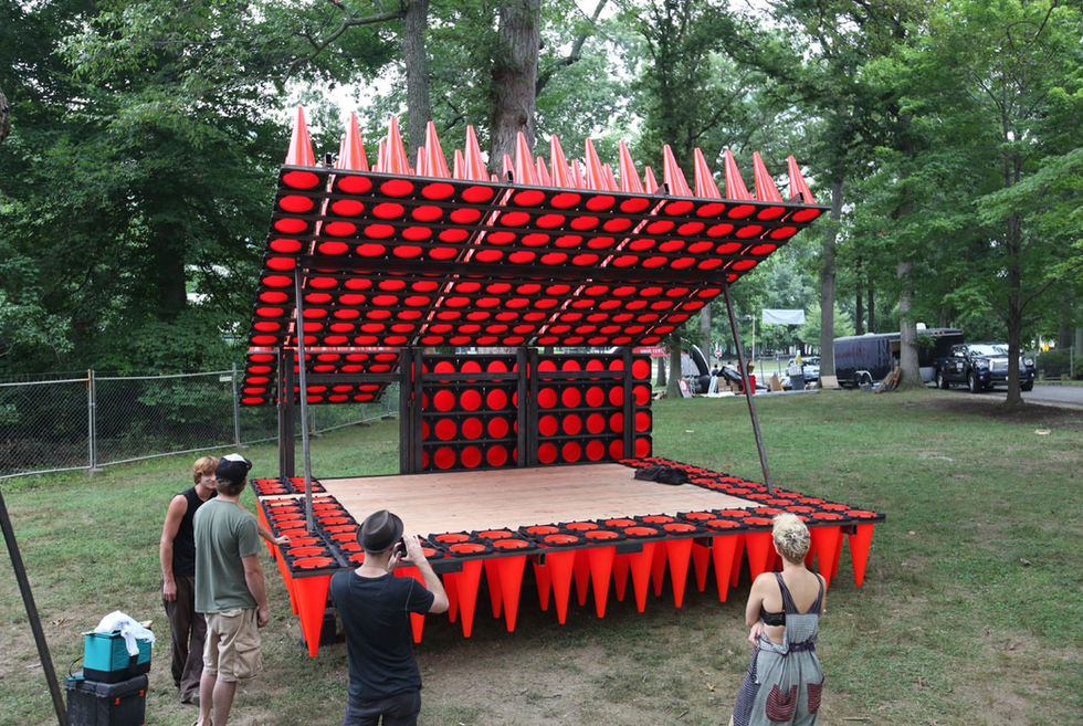 A 15’ x 15’ temporary performance pavilion designed under the restrictions of an extremely small budget and a wildly short timeline, Hedgehog hosted a lineup of diverse street performers from around the country, participating in an effort to raise money for youth homelessness. Part of a large one-day summer concert festival attended by 35,000 people, Hedgehog was designed as a modular steel frame wrapped by a spiky skin of 300 standard traffic cones and was erected in under 6 hours. The temporary nature of the concert event called for a “pop-up” architecture that turned speed to its advantage, using ready-made materials in an unexpected way. The intense repetition of the ubiquitous traffic cone, an element of the street displaced into the woods, allowed this item to overcome its usual message of danger and caution and instead promote a sense of festivity, even euphoria. Fitted with a state of the art sound system, Hedgehog happily stood out as a misplaced object invited for a short stay in a wooded setting.